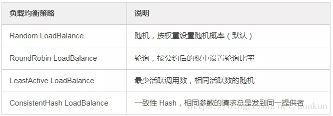 ConstantHash LoadBalance: 一致性Hash策略,使相同参数请求总是发到同一提供者,一台机器宕机,可以基于虚拟节点,分摊至其他提供者,避免引起提供者的剧烈变动; 缺省时为Random随机调用