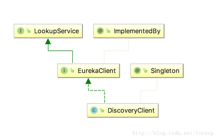 其中DiscoveryClient实现了EurekaClient接口,并且它是一个单例模式,而EurekaClient继承了LookupService接口。它们之间的关系如图所示。