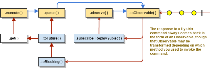 同步调用execute()调用queue().get(). queue()依次调用toObservable().toBlocking().toFuture()。 这就是说,最终每个HystrixCommand都由一个Observable实现支持,甚至是那些旨在返回单个简单值的命令。
