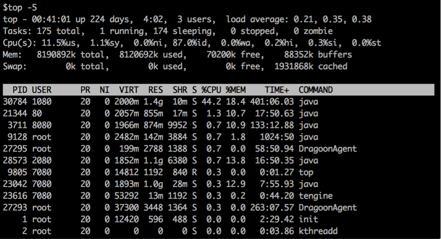 - \%nice:通过nice该表了进程调度优先级的进程,在用户模式下消耗的cpu时间的比例