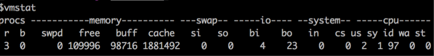 r列表示等待cpu时间片的进程数,如果长期大于1,说明cpu不足,需要增加cpu。