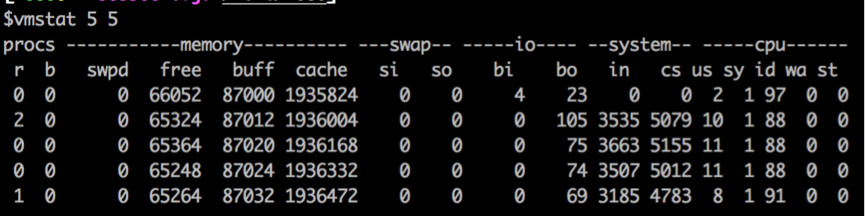 最好使用vmstat t [n]命令,例如vmstat 5 5,表示在T(5)秒时间内进行N(5)次采样。如果只使用vmstat,无法反映真正的系统情况。