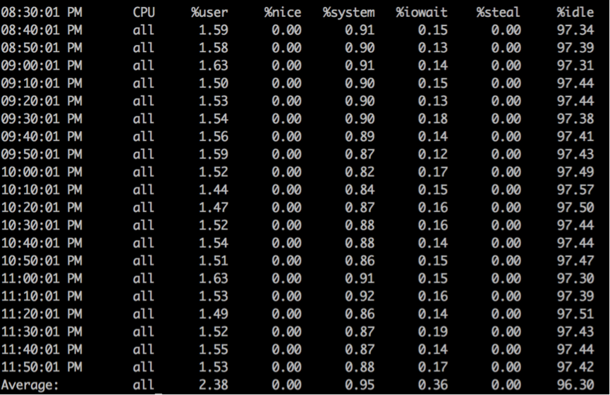 - \%idle:cpu没有等待磁盘I/O等待空闲状态消耗的时间比例