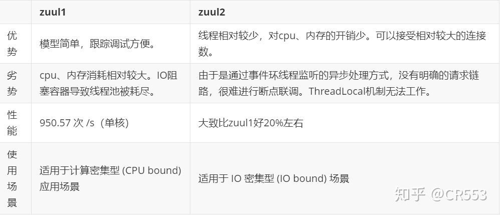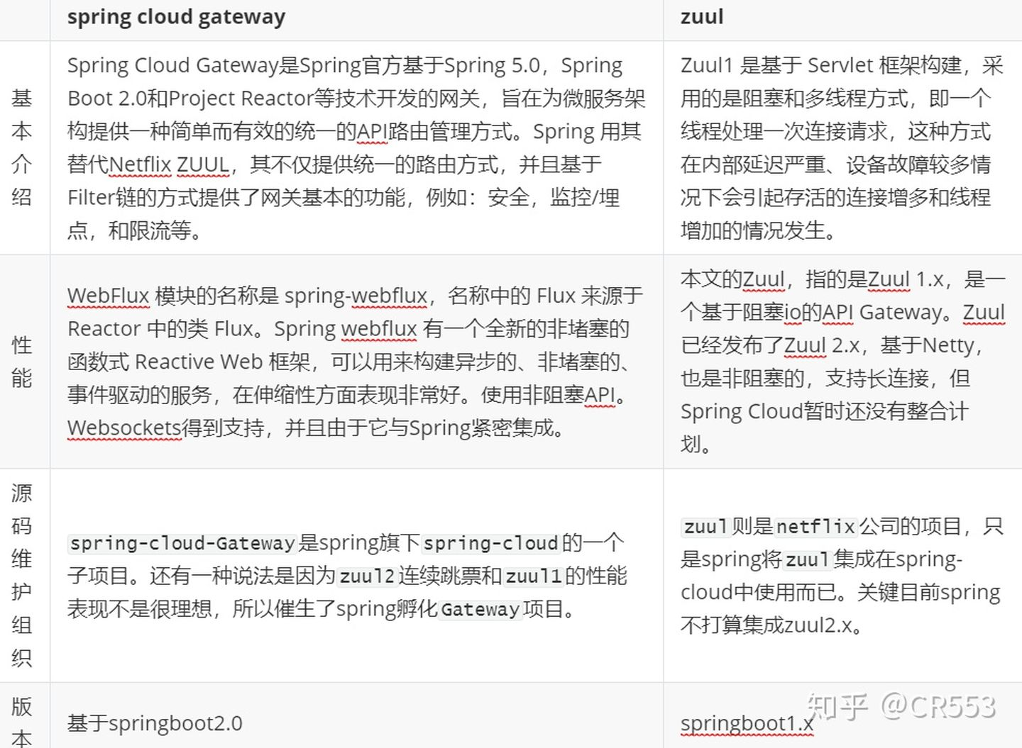 Spring Cloud Gateway构建于 Spring 5+,基于 Spring Boot 2.x 响应式的、非阻塞式的 API。同时,它支持 websockets,和 Spring 框架紧密集成,开发体验相对来说十分不错。由于zuul2没有被spring cloud所集成,所以拿zuul1与spring cloud gateway做一些简单的比较。